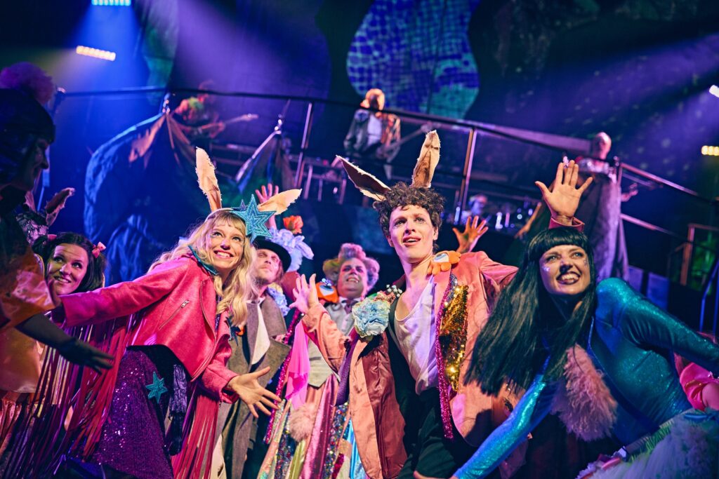 På scenen står et strålende hold: et ensemble i verdensklasse med bl.a. Shaka Loveless, Kristian Rossen, Nanna Rossen og Astrid Højgaard – og naturligvis de to hovedfigurer, spillet og sunget eminent af Søren Torpegaard Lund og Sofie Topp Christensen. Hertil kommer akrobater og dansere, der gang på gang sender publikum tilbage i sædet af ren lykkerus, og et orkester, der spiller hamrende fantastisk. Som visuelle højdepunkter får vi to enorme oppustelige kaniner, der i første akt rejser sig på scenen i et imponerende syn – og til allersidst kulminerer det hele med en spektakulær finale, hvor en gigantisk gummibåd svæver hen over scenen med de dansende hovedroller i. Det er legesyg, overdådig og storladen teatermagi, som vi sluger råt – alt imens kliché-klovnene svinger hulahopringe til ”Mr. Swing King”.